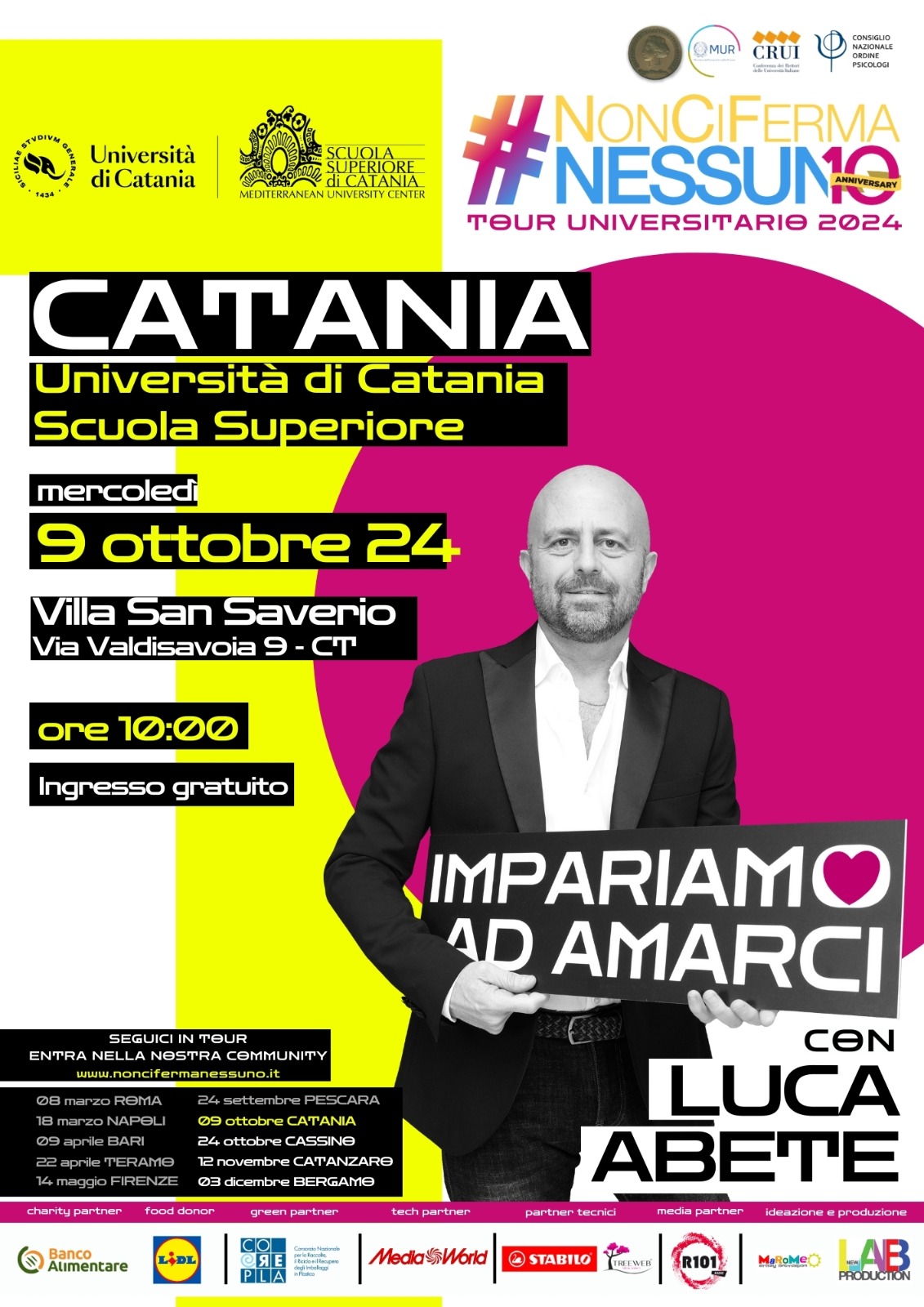 È prevista la presenza del rettore Prof. Francesco Priolo e la consegna del Premio #NonCiFermaNessuno ad uno studente o a una studentessa che si renderà interprete dei valori del tour motivazionale attraverso il racconto della sua storia.