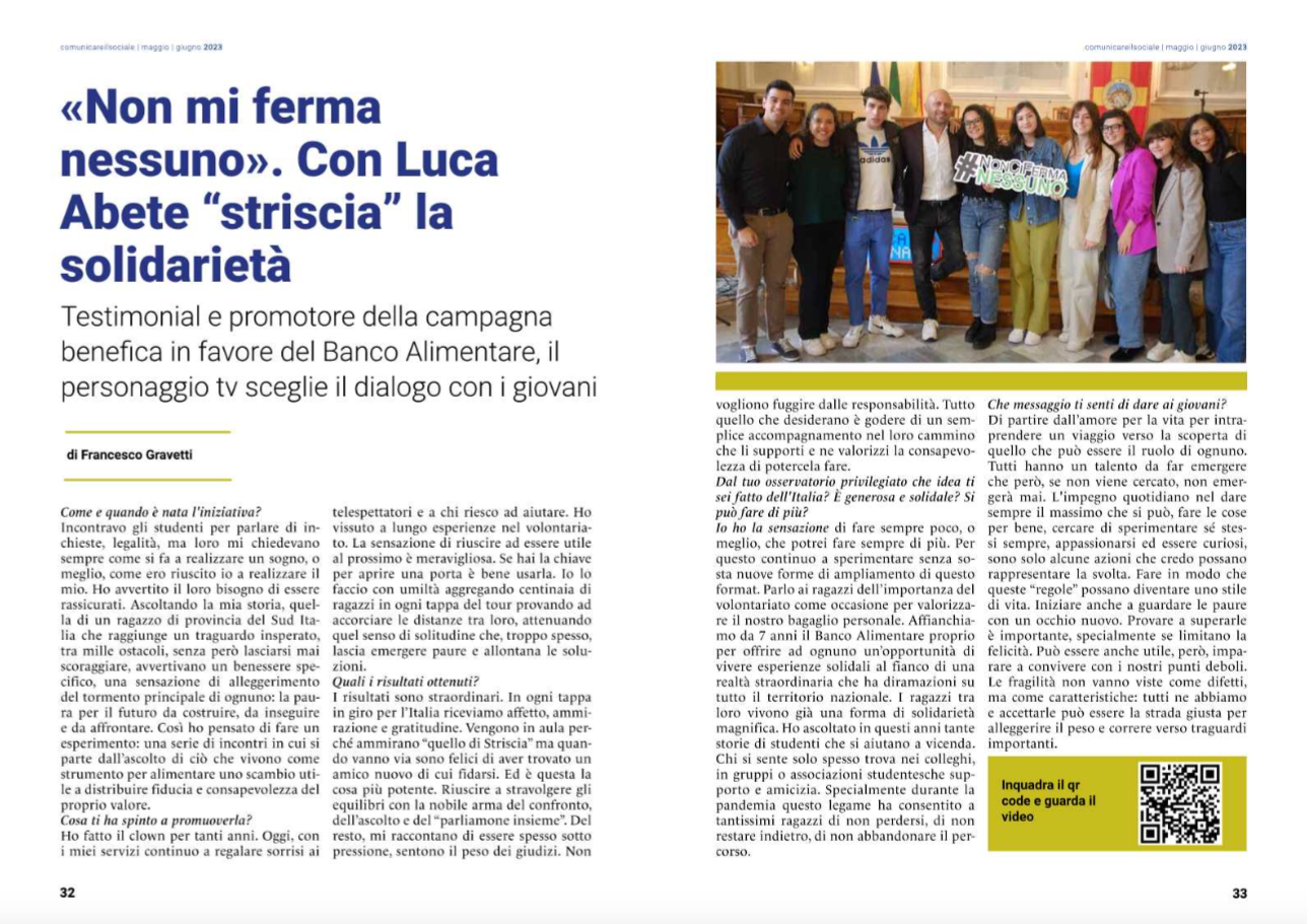 Luca Abete, intervistato per Comunicare per il Sociale da Francesco Gravetti, parla della vocazione solidale della campagna sociale #NonCiFermaNessuno, dei valori che vengono diffusi tra i ragazzi e delle azioni a favore del Banco Alimentare.