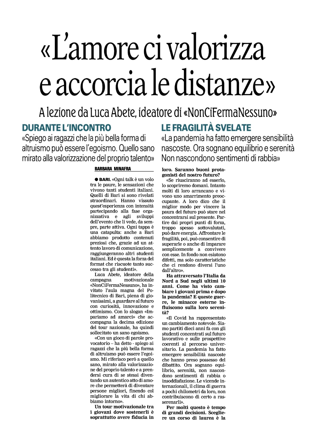 Luca Abete, ideatore della campagna motivazionale ‹NonCiFermaNessuno», ha invitato l’aula magna del Politecnico di Bari, piena di gio-vanissimi, a guardare al futuro con curiosità, innovazione e ottimismo. Con lo slogan «Impariamo ad amarci» che accompagna la decima edizione del tour nazionale, ha quindi sollecitato un sano egoismo.