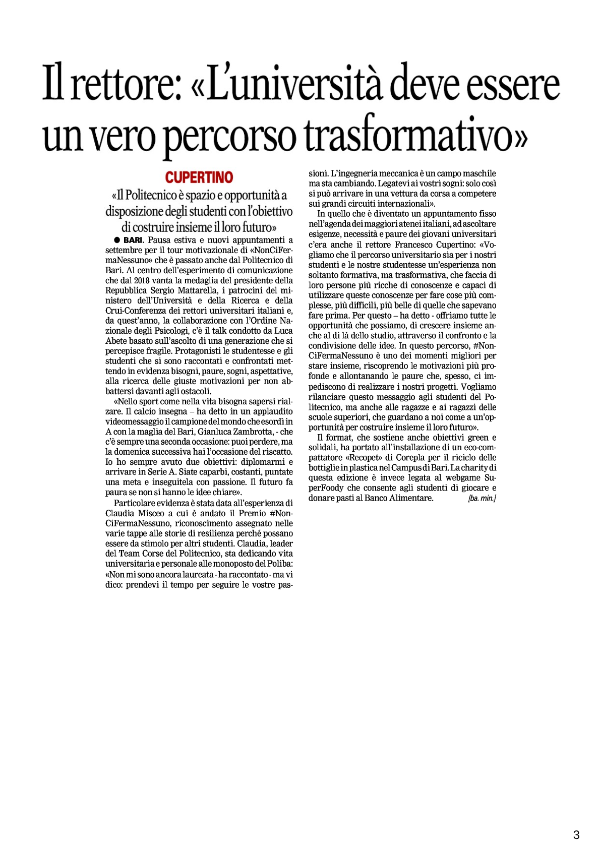 In quello che è diventato un appuntamento fisso nell’agenda dei maggiori atenei italiani, ad ascoltare esigenze, necessità e paure dei giovani universitari c’era anche il rettore Francesco Cupertino: «Vogliamo che il percorso universitario sia per i nostri studenti e le nostre studentesse un’esperienza non soltanto formativa, ma trasformativa, che faccia di loro persone più ricche di conoscenze e capaci di utilizzare queste conoscenze per fare cose più complesse, più difficili, più belle di quelle che sapevano fare prima. Per questo – ha detto – offriamo tutte le opportunità che possiamo, di crescere insieme anche al di là dello studio, attraverso il confronto e la condivisione delle idee. In questo percorso, #Non-CiFermaNessuno è uno dei momenti migliori per stare insieme, riscoprendo le motivazioni più profonde e allontanando le paure che, spesso, ci impediscono di realizzare i nostri progetti. Vogliamo rilanciare questo messaggio agli studenti del Politecnico, ma anche alle ragazze e ai ragazzi delle scuole superiori, che guardano a noi come a un’opportunità per costruire insieme il loro futuro».