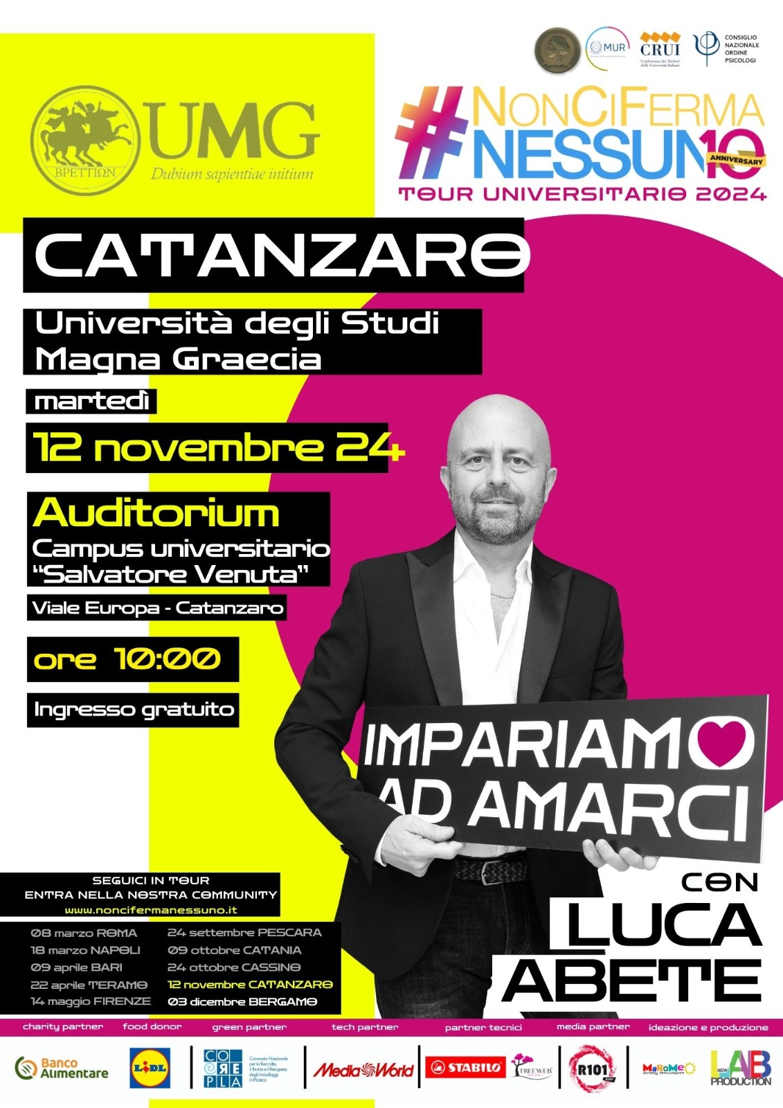 Torna a Catanzaro il tour motivazionale #NonCiFermaNessuno. L’appuntamento è in programma per martedì 12 novembre, alle ore 10.00, presso l’Auditorium del campus universitario ”Salvatore Venuta” dell’Universitá degli Studi di Catanzaro “Magna Graecia”.