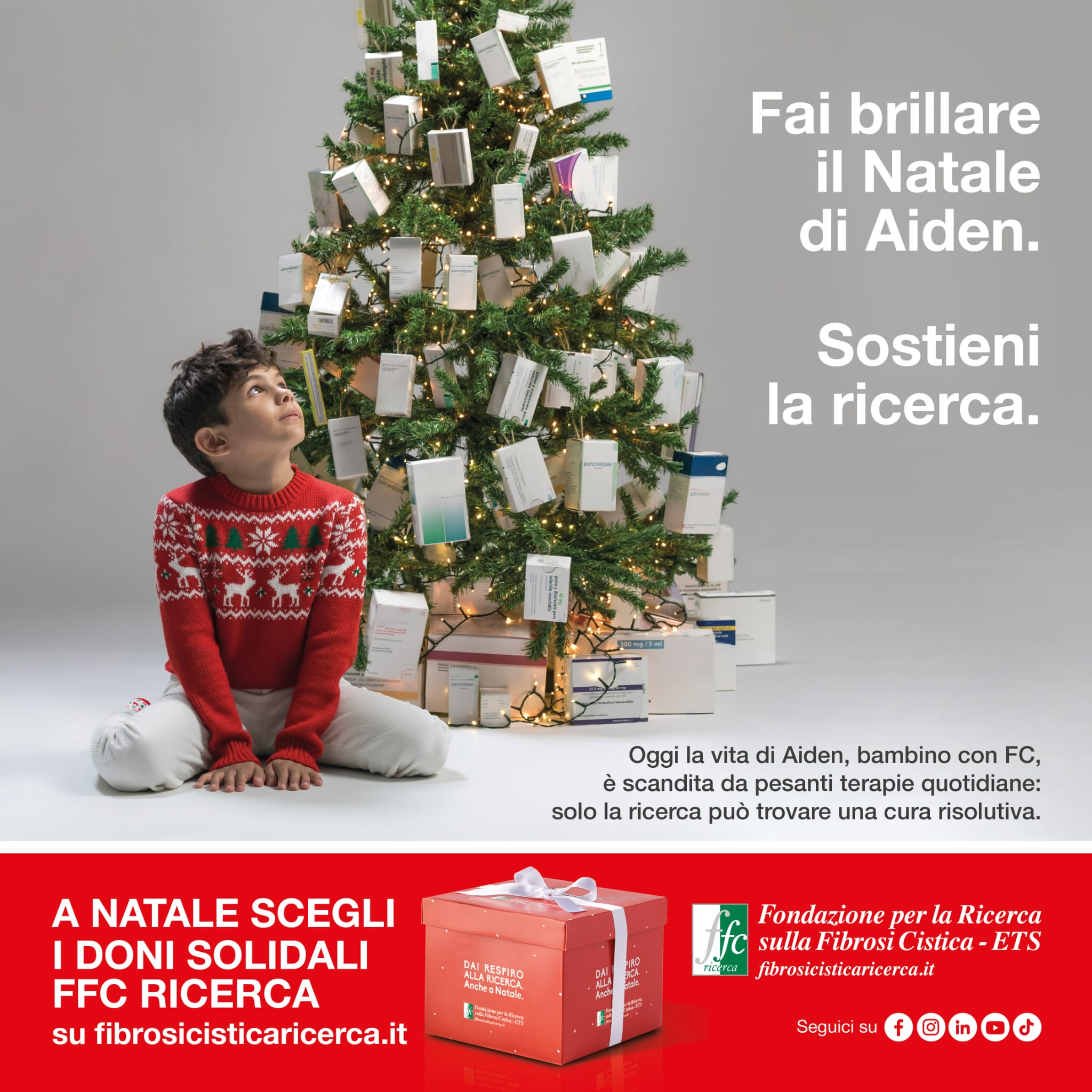 Quest’anno la Fondazione dedica la sua Campagna di Natale ad Aiden, un bambino che convive ogni giorno con la fibrosi cistica. Accanto a lui, un albero speciale: non addobbato con sfere o nastri, ma con le scatole dei farmaci che fanno parte della sua quotidianità. Un’immagine potente, che racconta la realtà della malattia, ma anche la forza, la determinazione e la possibilità di un domani diverso.