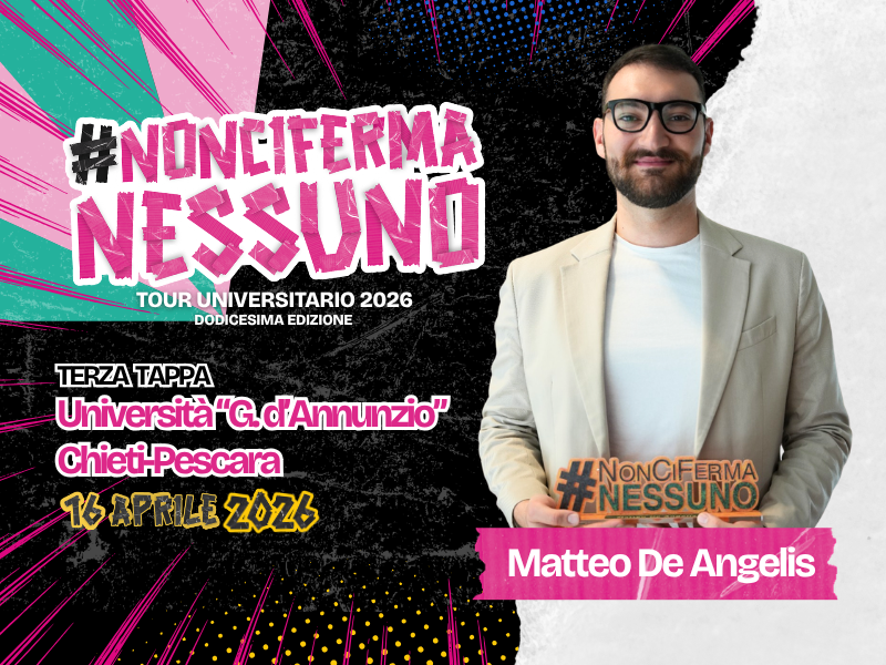 In occasione della terza tappa della 12esima edizione di #NonCiFermaNessuno di Luca Abete all’Università “G. d’Annunzio” di Chieti-Pescara, il Premio #NonCiFermaNessuno è stato consegnato a Matteo De Angelis, studente del sesto anno di medicina impegnato in missioni umanitarie e scientifiche prima in Nepal poi in Burundi e in partenza per una nuova missione in Sudan. «Ho preferito rallentare gli studi per inseguire il sogno della mia vita: aiutare chi ha bisogno. In Burundi il ricordo più emozionante: una bambina che con il suo papà ha camminato per una settimana per essere operata».