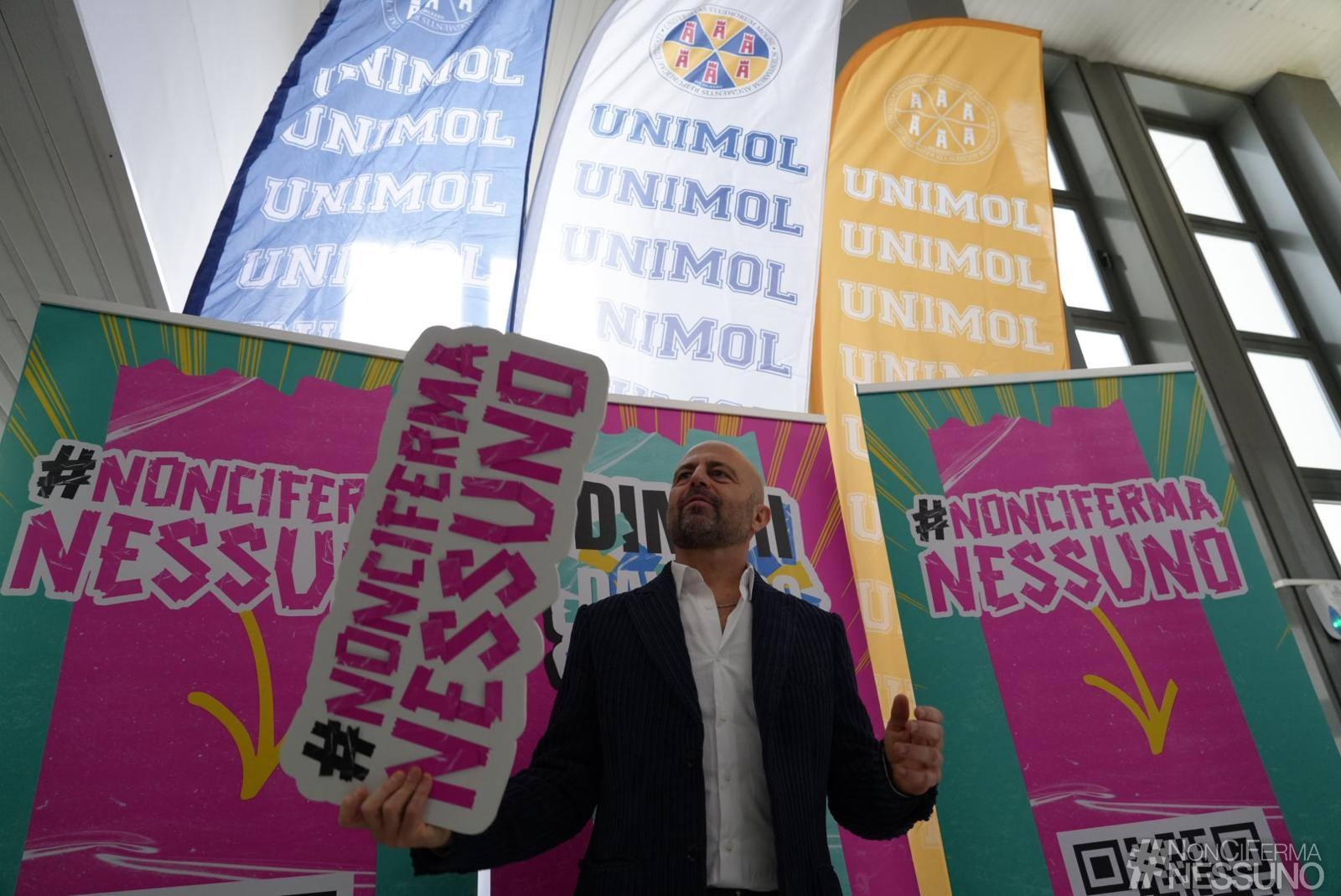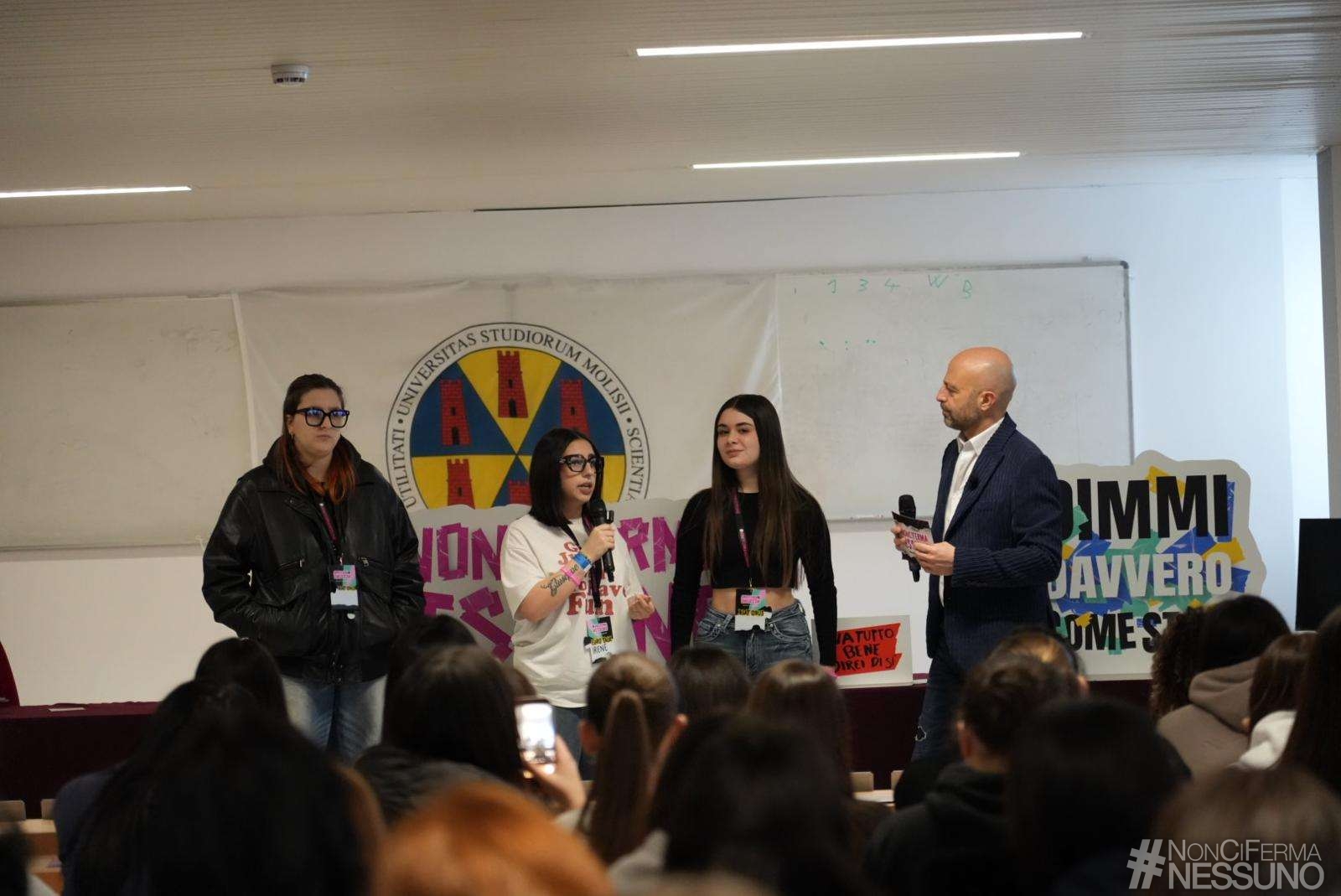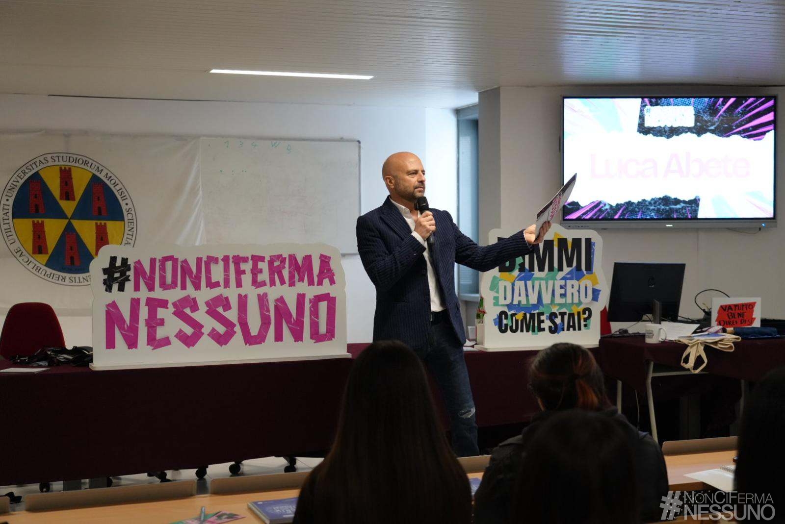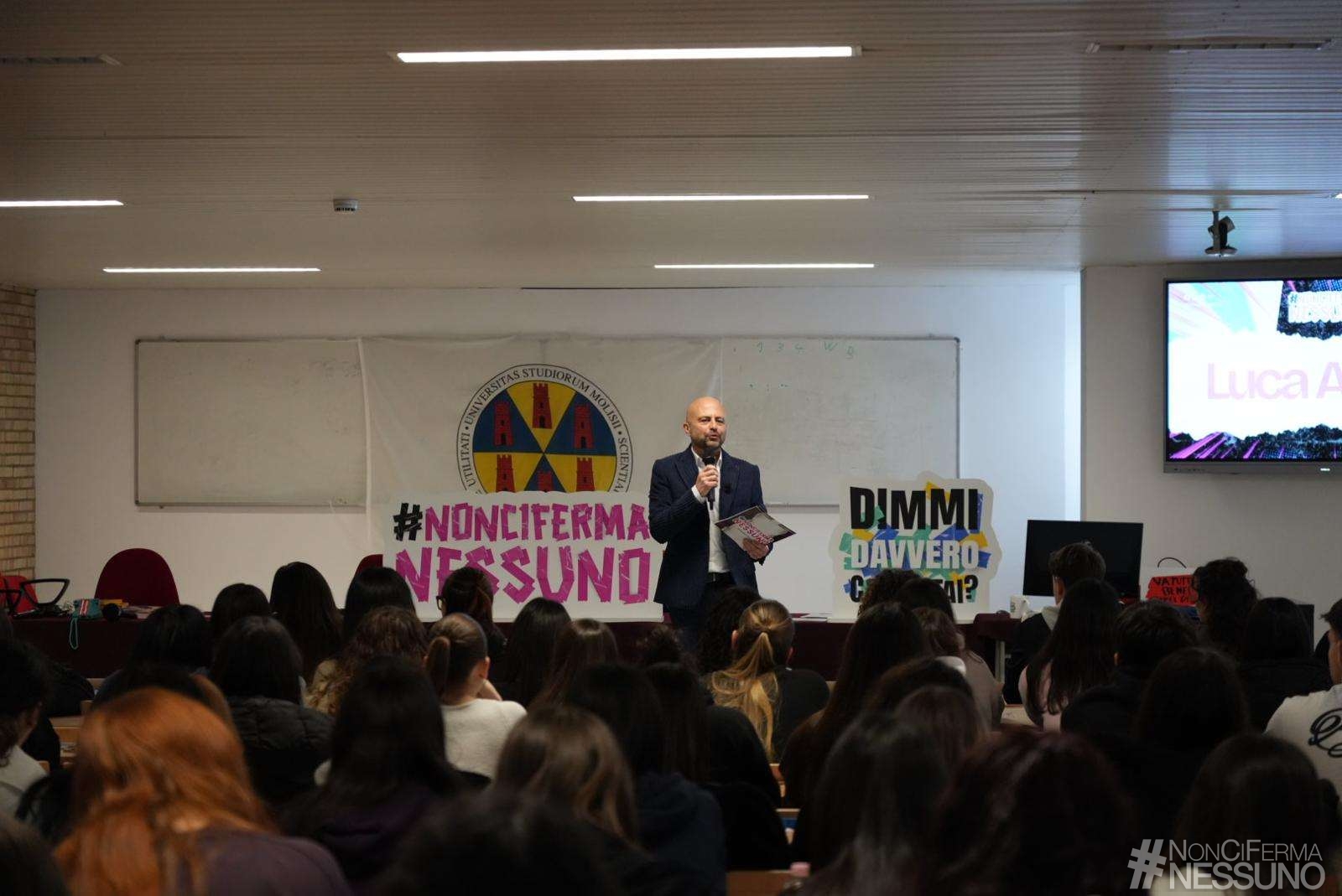 Come stanno davvero i giovani? È la domanda che #NonCiFermaNessuno di Luca Abete ha posto agli oltre 250 studenti dell’aula “Antonio Genovesi” dell’Università degli Studi del Molise. «Non sono venuto a Campobasso per lasciare risposte pronte da usare ma per portarmi via verità che altrove faccio più fatica a trovare. Qui sento meno rumore e più sostanza, meno scena e più vita vissuta. E quando il rumore si abbassa, le persone parlano di più e si raccontano meglio».