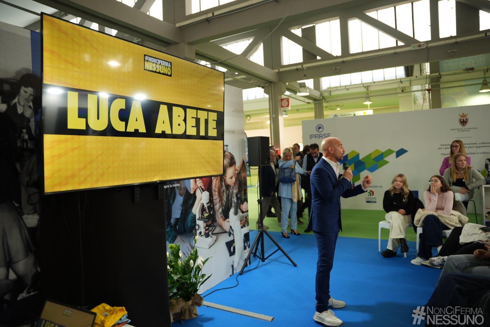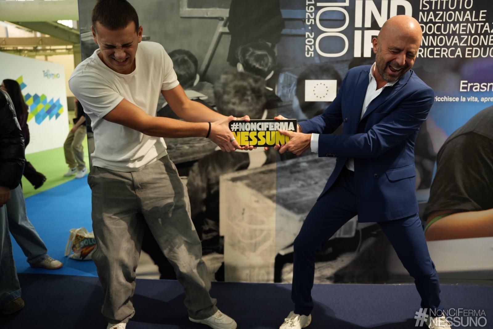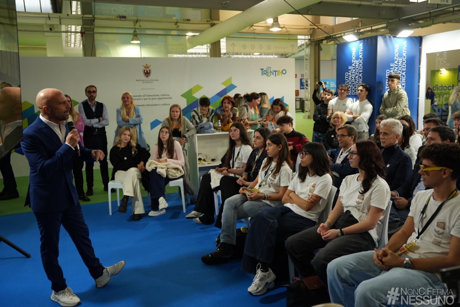 Tappa speciale della campagna sociale motivazionale #NonCiFermaNessuno di Luca Abete che ha preso parte a Didacta Italia – Edizione Trentino a Riva del Garda, nell’ambito del progetto Erasmus+ promosso dall’Agenzia INDIRE. Un’occasione unica per l’appuntamento più importante sulla formazione e l’innovazione del mondo della scuola in Italia. «Essere oggi a Didacta non è vetrina, ma un’alleanza con chi vuole elaborare strumenti nuovi per consentire ai ragazzi di continuare a rincorrere i propri sogni – afferma Abete –. Siamo qui per affilare le idee che domani taglieranno le paure e distribuiranno preziosi pezzi di coraggio. Mentre ci si affida sempre più alla tecnologia, la nostra campagna sociale porta la vera rivoluzione analogica: dare valore alle voci invisibili, trasformando le esperienze in patrimonio collettivo utile a diffondere fiducia, coraggio e un bel po’ di entusiasmo».