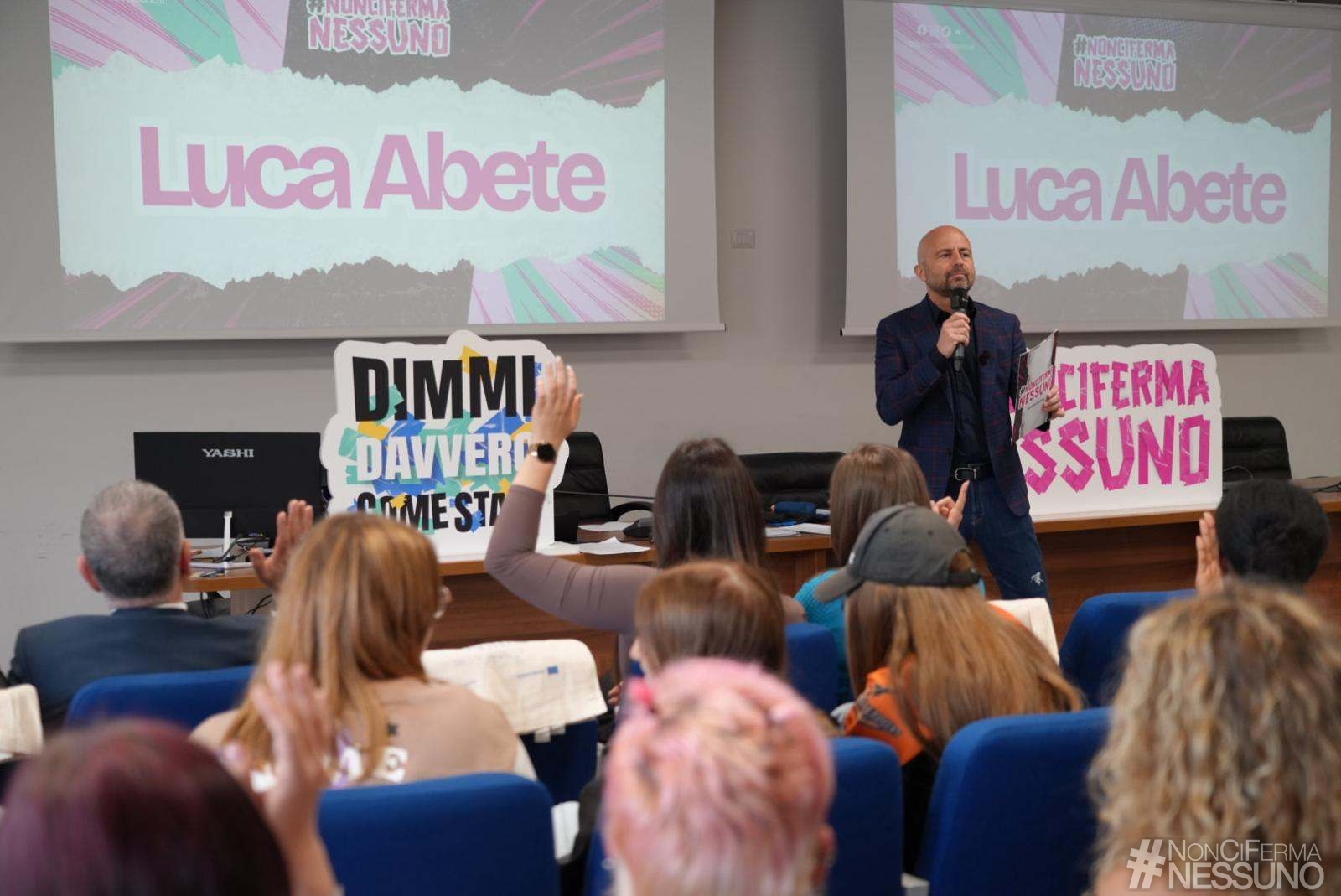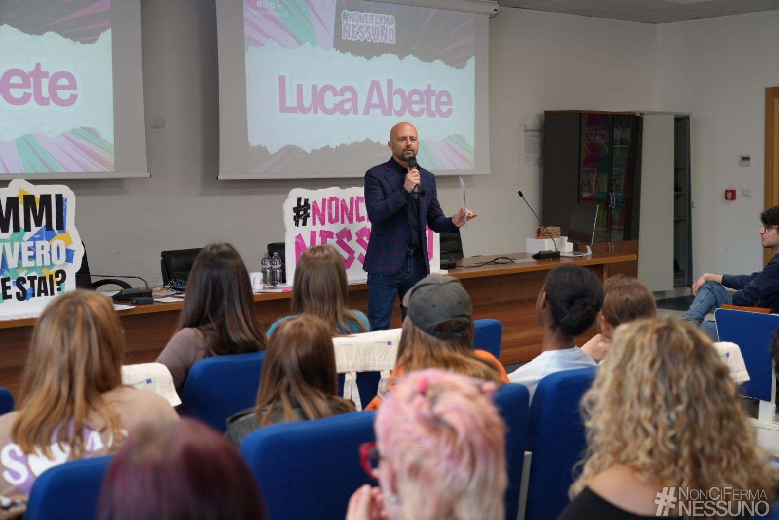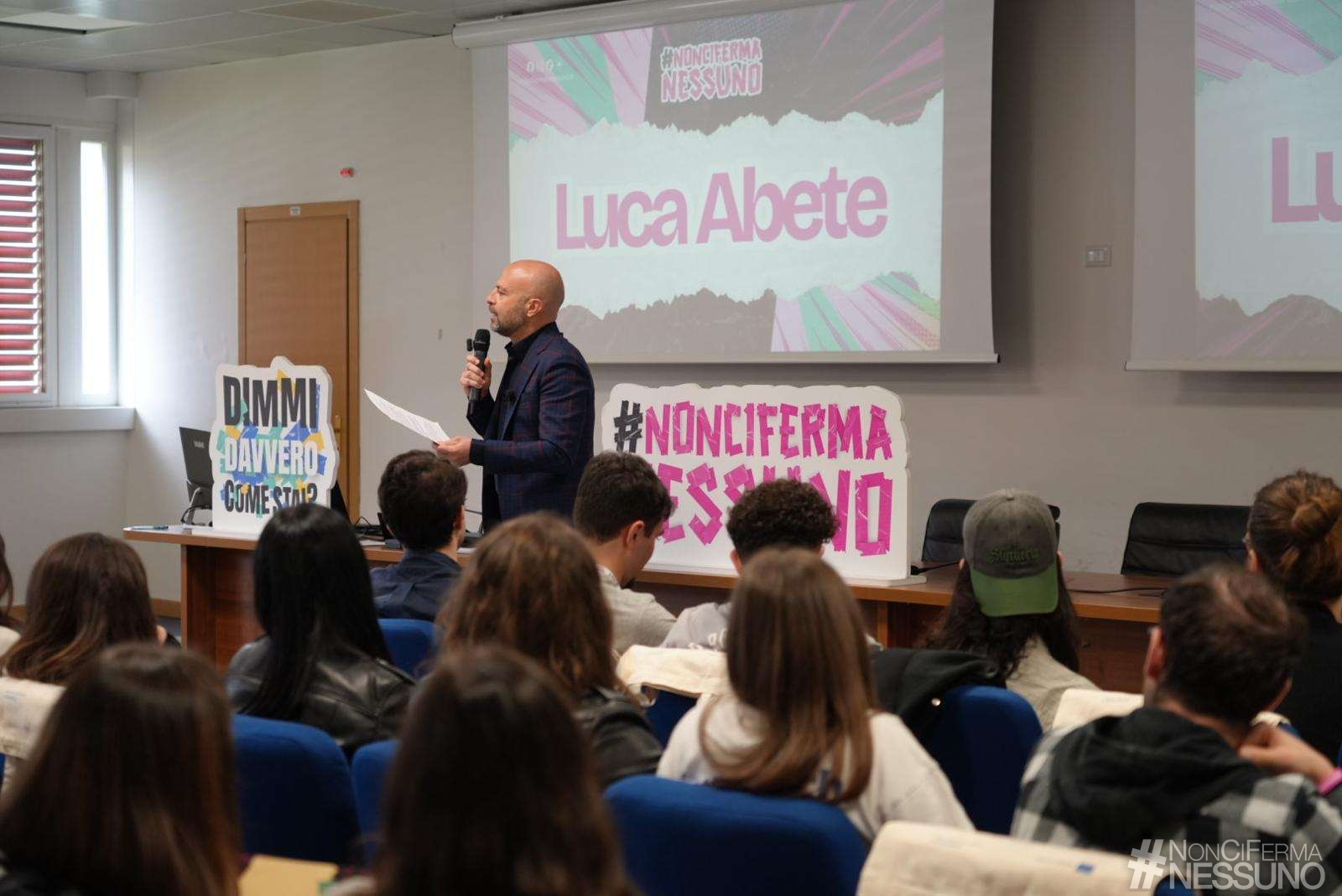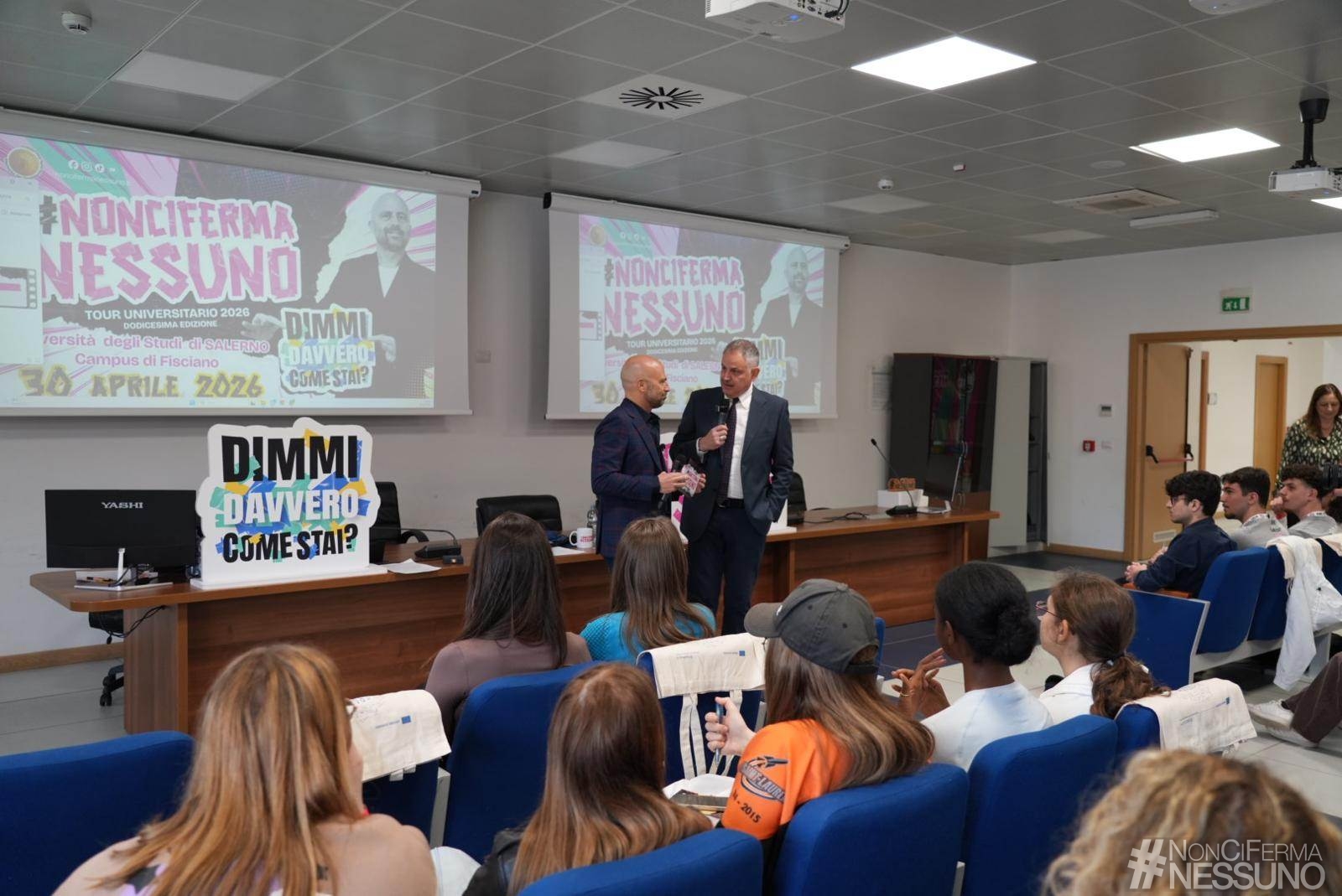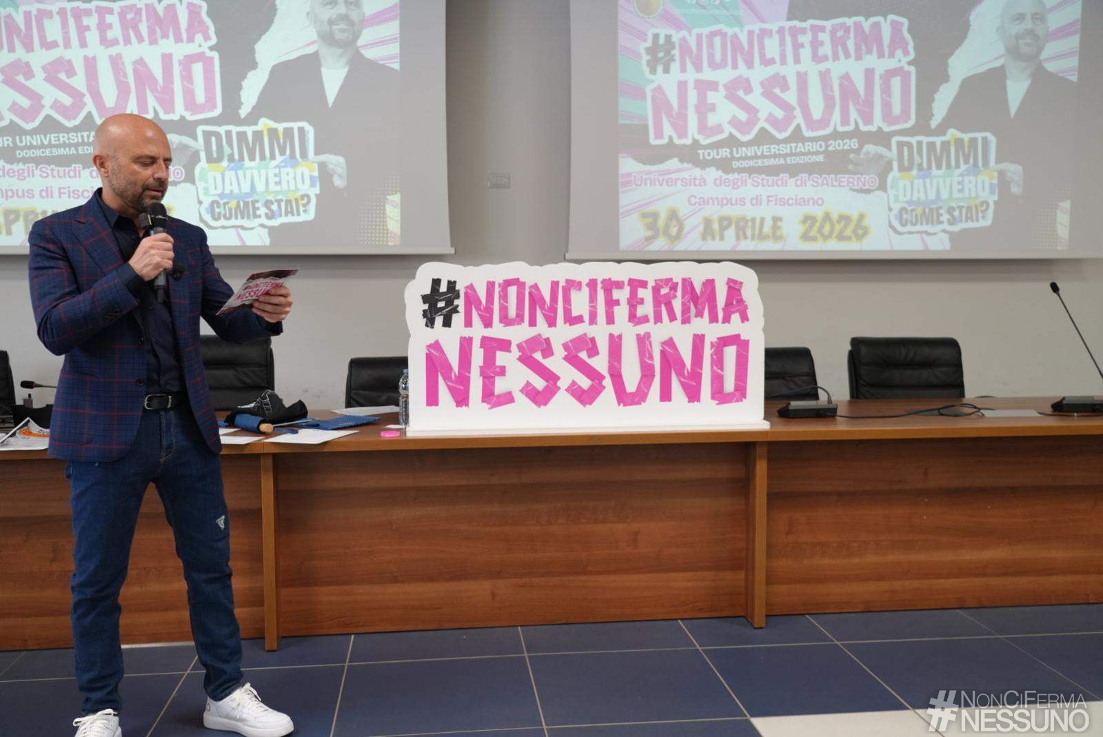Che cosa significa davvero dire “sto bene”? È da questa domanda che ha preso forma la tappa salernitana di #NonCiFermaNessuno, la campagna sociale di Luca Abete che ha coinvolto centinaia di studenti nell’Aula De Rosa del campus di Fisciano dell’Università degli Studi di Salerno. «A Salerno oggi ho ascoltato gli studenti con molta attenzione e ho avuto conferma che non sono i ragazzi a essere in difficoltà. È il contesto che abbiamo costruito per loro a creare disagio».