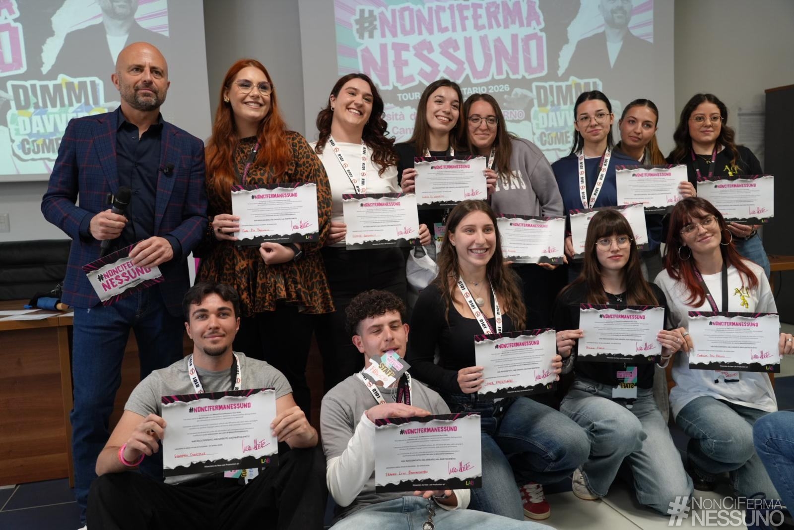 Nei giorni precedenti l’evento, un gruppo di 15 studentesse e studenti ha preso parte al Laboratorio dei Linguaggi della Comunicazione diretto da Luca Abete, trasformando idee e riflessioni in contenuti social, azioni creative e momenti di sensibilizzazione. Un’esperienza partecipativa che ha messo i giovani al centro del progetto, rendendoli protagonisti attivi della campagna. «A tutti i partecipanti è stato consegnato un attestato – ha sottolineato Abete – ma soprattutto resta aperto uno spazio di ascolto continuo: i ragazzi possono continuare a raccontarsi, anche in forma anonima, attraverso la piattaforma dimmidavverocomestai.it».