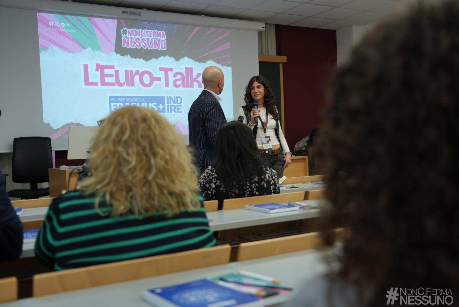 Gli Euro-Talks realizzati in collaborazione con l’Agenzia Nazionale Erasmus+ INDIRE hanno portato in aula le storie di studentesse e studenti protagonisti del programma. Tra queste, quella di Raffaella, rientrata in Italia dopo un’esperienza in Spagna: «La prima settimana è stata traumatica: ho pianto tutto il tempo, mi sentivo completamente sola. In sei mesi sono cambiata tanto: la me di un anno fa, timida e chiusa, non avrebbe mai partecipato a un evento del genere».