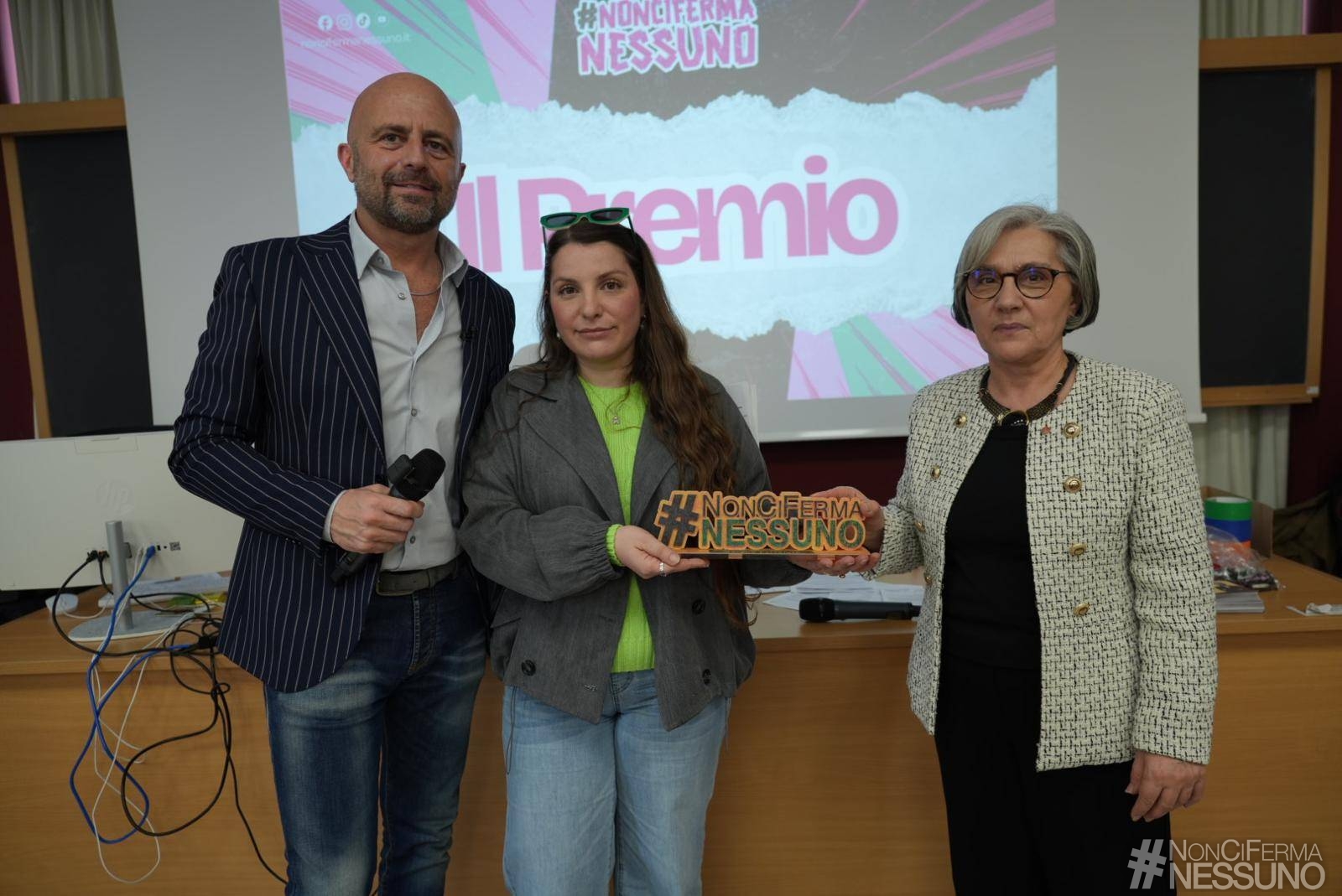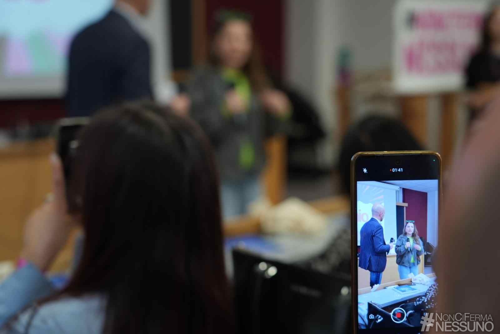 Toccante la testimonianza di Serena Ferraiolo, studentessa sorda della Facoltà di Scienze Politiche, che ha ricevuto il Premio #NonCiFermaNessuno. «Tutti dovrebbero imparare la lingua dei segni: io mi sono sentita spesso sola perché non riuscivo a comunicare. Ho abbandonato la Sicilia per trovare qui la mia dimensione. A 34 anni ho scelto la libertà: non mi importa laurearmi tardi, i giudizi non contano».