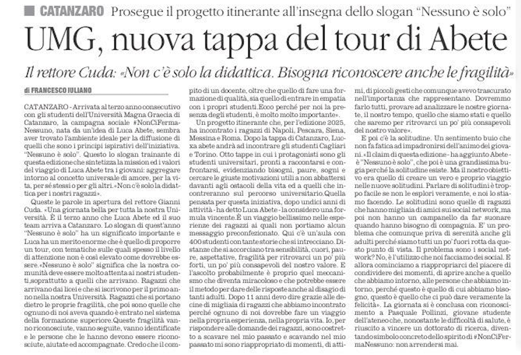 In occasione della sesta tappa del tour #NonCiFermaNessuno a Catanzaro, il Quotidiano del Sud ha dedicato un articolo alla campagna sociale motivazionale ideata da Luca Abete. Si legge: “Arrivata al terzo anno consecutivo con gli studenti dell’Università Magna Graecia di Catanzaro, la campagna sociale #NonCiFermaNessuno, nata da un’idea di Luca Abete, sembra aver trovato l’ambiente ideale per la diffusione di quelli che sono i principi ispirativi dell’iniziativa. Nessuno è solo: questo lo slogan trainante di questa edizione che sintetizza la mission e i valori del viaggio di Luca Abete tra i giovani“.