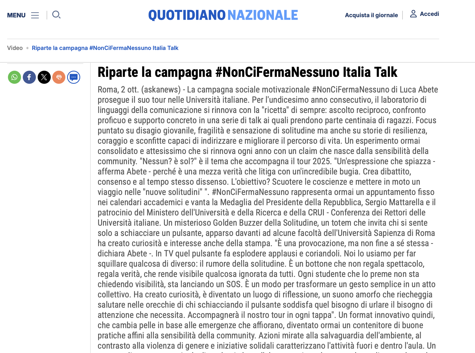 Quotidiano Nazionale – Riparte la campagna #NonCiFermaNessuno Italia Talk