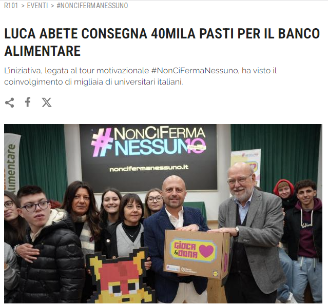 Un webgame per aiutare il Banco Alimentare, rendere protagonisti migliaia di giovani italiani, dare una veste moderna al concetto di solidarietà. Questo è in sintesi SuperFoody, il format ideato da Luca Abete nell’ambito della sua campagna sociale motivazionale universitaria #noncifermanessuno. Un tour in 10 università che vanta la medaglia del Presidente della Repubblica Sergio Mattarella, in cui la parola d’ordine è “ascolto” e i giovani, motore di un confronto senza filtri sulla loro realtà, protagonisti assoluti e di cui R101 è radio partner.