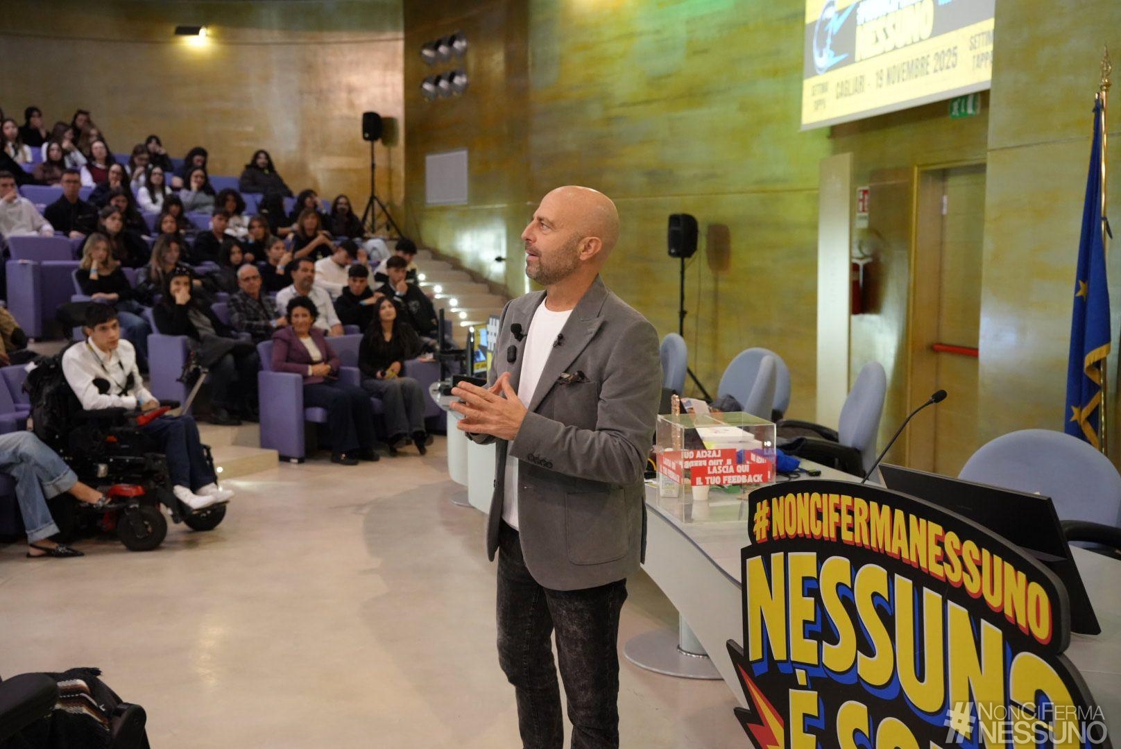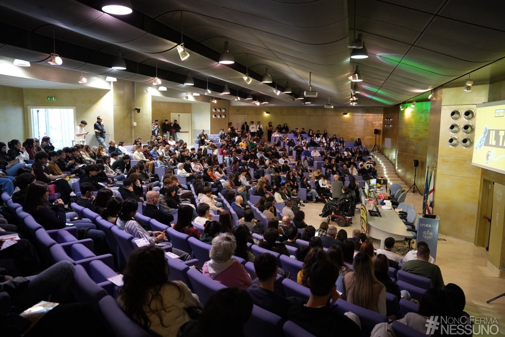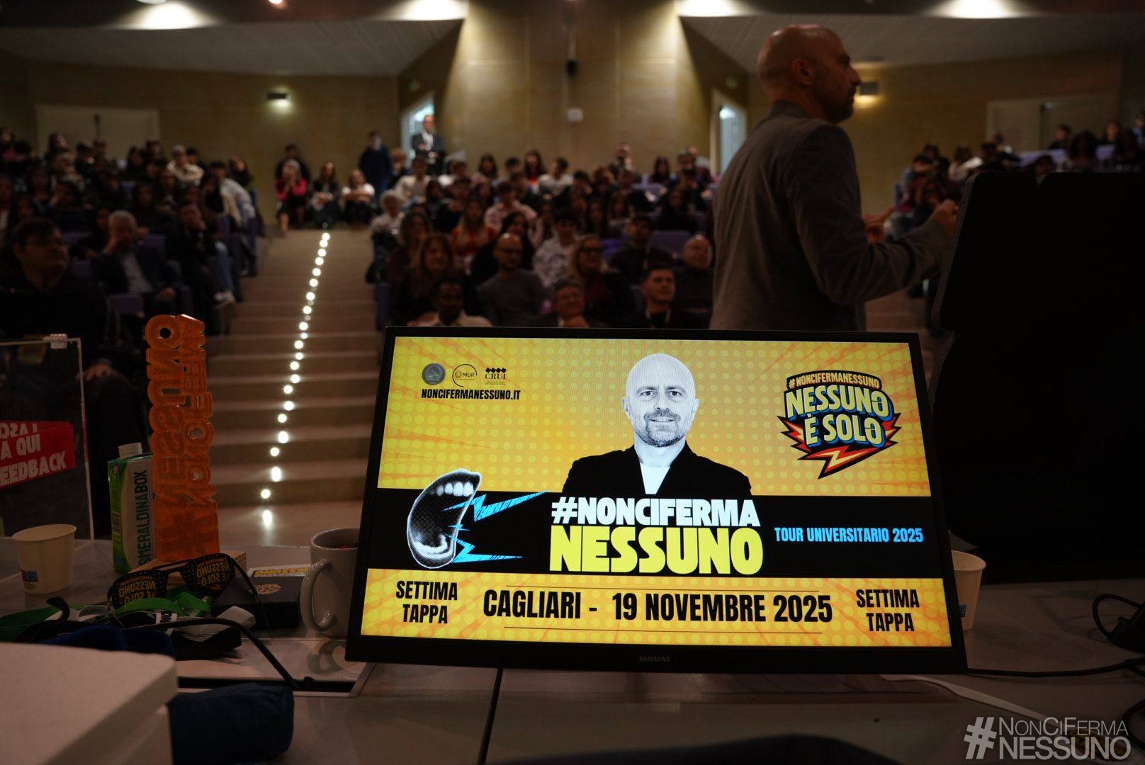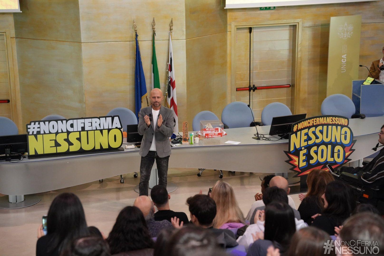 È stata un successo la prima volta in Sardegna di #NonCiFermaNessuno. La campagna sociale motivazionale è approdata all’Università degli Studi di Cagliari, dove oltre 300 studenti e studentesse hanno accolto con entusiasmo l’iniziativa ideata nel 2014 da Luca Abete. «Non portiamo motivazione ma umanizzazione – afferma l’inviato di Striscia la notizia –. Non siamo qui per convincere nessuno a essere felice. Ritengo sia giusto ricordare che la tristezza esiste, che anche la paura merita rispetto e che la fragilità non è un difetto. Ma, anzi, è una porta. E talvolta può bastare semplicemente chiamare per nome chi pensa si tratti di un muro maledetto e non vede quella maniglia da impugnare».
