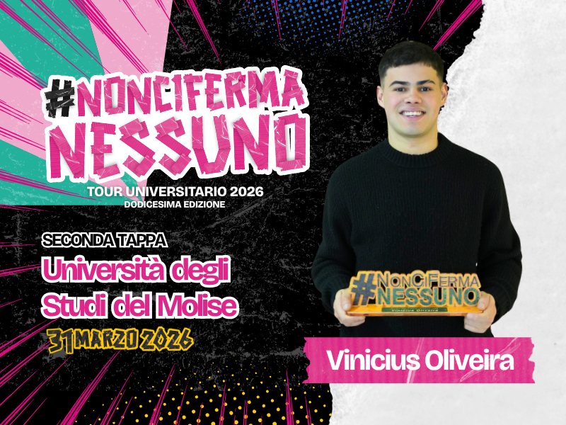 In occasione della seconda tappa della 12esima edizione di #NonCiFermaNessuno presso l’Università degli Studi del Molise, il Premio #NonCiFermaNessuno – che da sei anni celebra storie di eroismo quotidiano e che in autunno vivrà un evento conclusivo che coinvolgerà oltre 50 Università italiane -, è stato assegnato allo studente Vinicius Oliveira. Arrivato in Italia dal Brasile a 17 anni, ha affrontato difficoltà legate a una nuova cultura, alla lingua e anche a infortuni, senza mai arrendersi. Con impegno e costanza è diventato portiere titolare del CLN CUS Molise e ha conquistato l’oro ai Campionati Nazionali Universitari di Ancona 2025, distinguendosi allo stesso tempo anche negli studi in Scienze Motorie. «A 17 anni ho lasciato la mia famiglia in Brasile per inseguire il mio sogno: giocare a calcio a 5. I primi tempi sono stati molto difficili: nonostante una serie di infortuni alla fine ha vinto la mia caparbietà». Al premiato è stato consegnato un manufatto realizzato dagli artigiani 2.0 di Polilop.